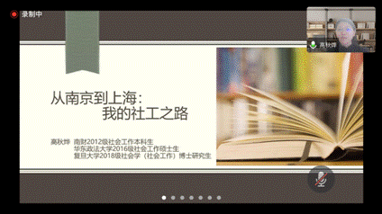 首先是2012级的高秋烨,她在2016年攻读华东政法大学社会工作专业硕士研究生,在2018年至今攻读复旦大学社会工作专业博士。在本科阶段,她注册成立了社工机构“南京市栖霞区欣阳社会工作站”,创办的“玩具图书馆”项目也持续传承,让一届又一届的社工学生在实践中体会社工的助人自助理念。她通过分享自己在南财读社工的心路漫谈以及考研、考博之路,从实践、考研等角度为学弟学妹们提供方向。