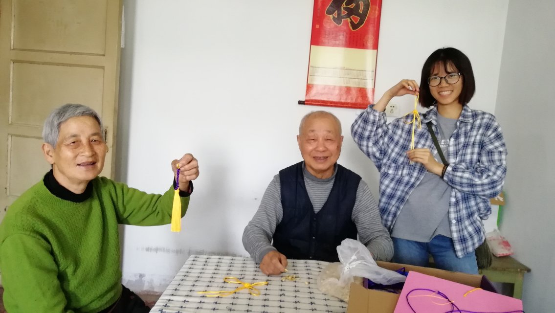 4月17日下午,南京市第六届大学生公益创业大赛的南京财经大学“夕阳无限,爱在晚年”——残障老人个案帮扶项目的团队成员来到栖霞区尧化新村的五户老年残障人士的家里开展服务活动——编织中国结。