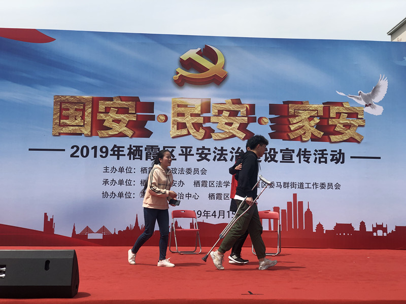 4月15日,“国安·民安·家安——2019年栖霞区平安法治建设宣传活动”在马群街道南湾营广场举行。当天,武术、歌曲、小品精彩节目连番上演,让大家更加形象地了解到方方面面的国家安全知识。现场还特别设置了互动问答环节,台下的观众踊跃举手,积极互动,气氛一片欢乐。我校法律援助中心情景剧表演团队应栖霞区法学会的邀请,为现场观众带来了小品《车神落难我出马,法援助人喜开颜》,节目展现了无助民工在劳动纠纷无法解决的情况下,法律援助是如何施以援手帮助其维护合法权益。