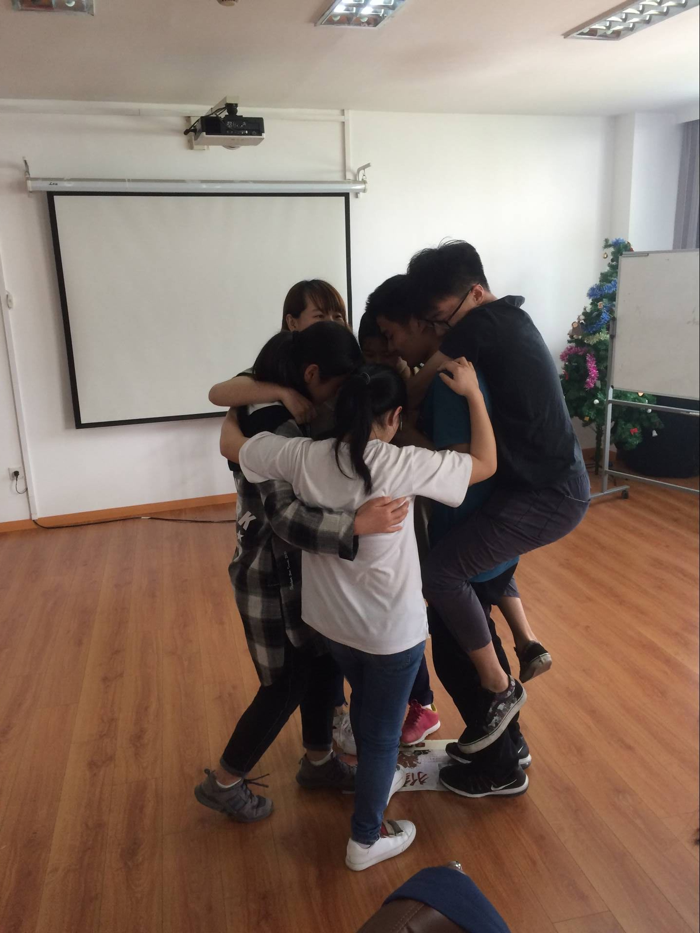 再者,是一项挑战协作能力的任务:要求每组成员站到一张不足30×30cm的纸上,虽然很难,但在大家的不断尝试后,两组都出色地完成了任务。