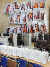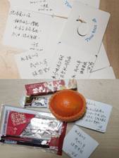 大三学生们首先邀请了社工系主任许芸副教授以及甘诺副教授等老师,为大四学生写下考研祝福语。同时,在助力包里放上锦鲤盲盒笔、涂卡文具包,为大四学生做好考前准备。一个橙子寓意着一定成功,德芙巧克力代表得到福气、在考场上思路畅滑,全都放在“一点心意”礼物袋里。