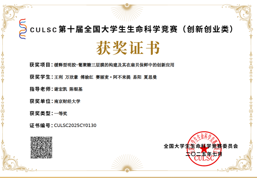 由我校食品科学与工程学院谢宏凯、陈银基两位老师悉心指导的项目《缓释型明胶——葡聚糖三层膜的构建及其在扇贝保鲜中的创新应用》,凭借新颖的研究思路、扎实的实验基础和良好的应用前景在全国决赛中脱颖而出,获得一等奖。该项目聚焦扇贝保鲜这一实际产业需求,创新构建缓释型三层膜,为水产品保鲜技术的升级提供了新思路,得到了评审专家的高度认可。