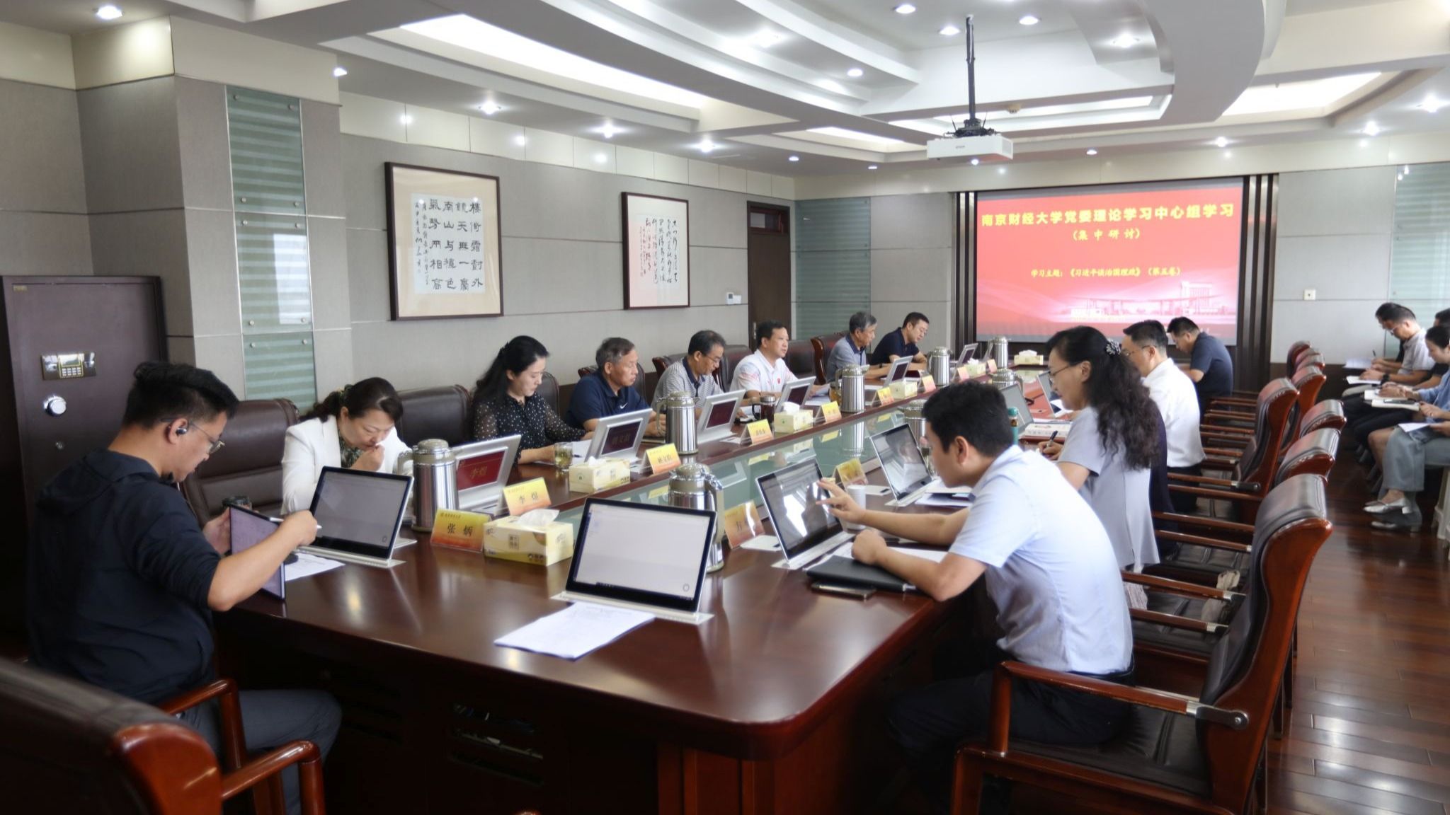 校党委书记张利民,校党委副书记李群,省纪委监委派驻南京财经大学纪检监察组组长、党委常委、纪委书记李茜,党委常委、副校长黄步龙,党委常委、副校长赵国栋,党委常委、副校长姚文韵,党委常委、副校长刘衍民,党委常委、副校长方勇,党委常委、统战部部长李玉琴,党委常委、宣传部部长朱军分别结合分管工作作会议交流。