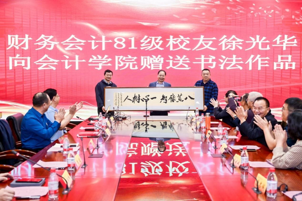 座谈会上还举行了简朴而温馨的捐赠仪式。校友徐光华代表财务会计81级毕业生将一幅亲手创作的书法作品赠予会计学院,以笔墨丹青表达对母校的深切祝福。