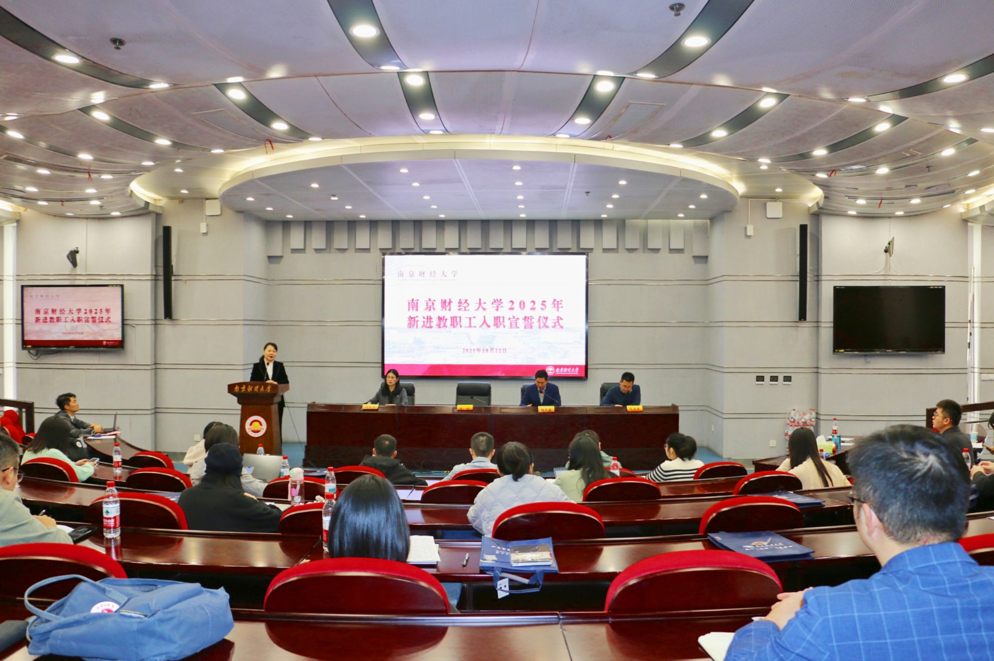 仪式上,新进教职工佩戴崭新的校徽,一起学唱校歌《南财大之歌》。随后,新进教职工在党委教师工作部副部长、人事处副处长何海新的带领下进行了庄严的入职宣誓。