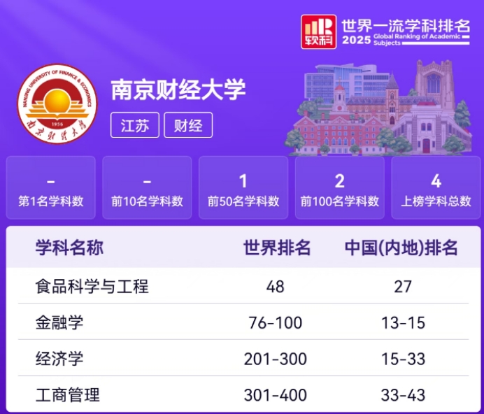 近日,高等教育评价专业机构软科正式发布2025“世界一流学科排名”。我校学科建设再创佳绩,共有4个学科荣登榜单,上榜总数位列全国财经类高校第5位(并列)。