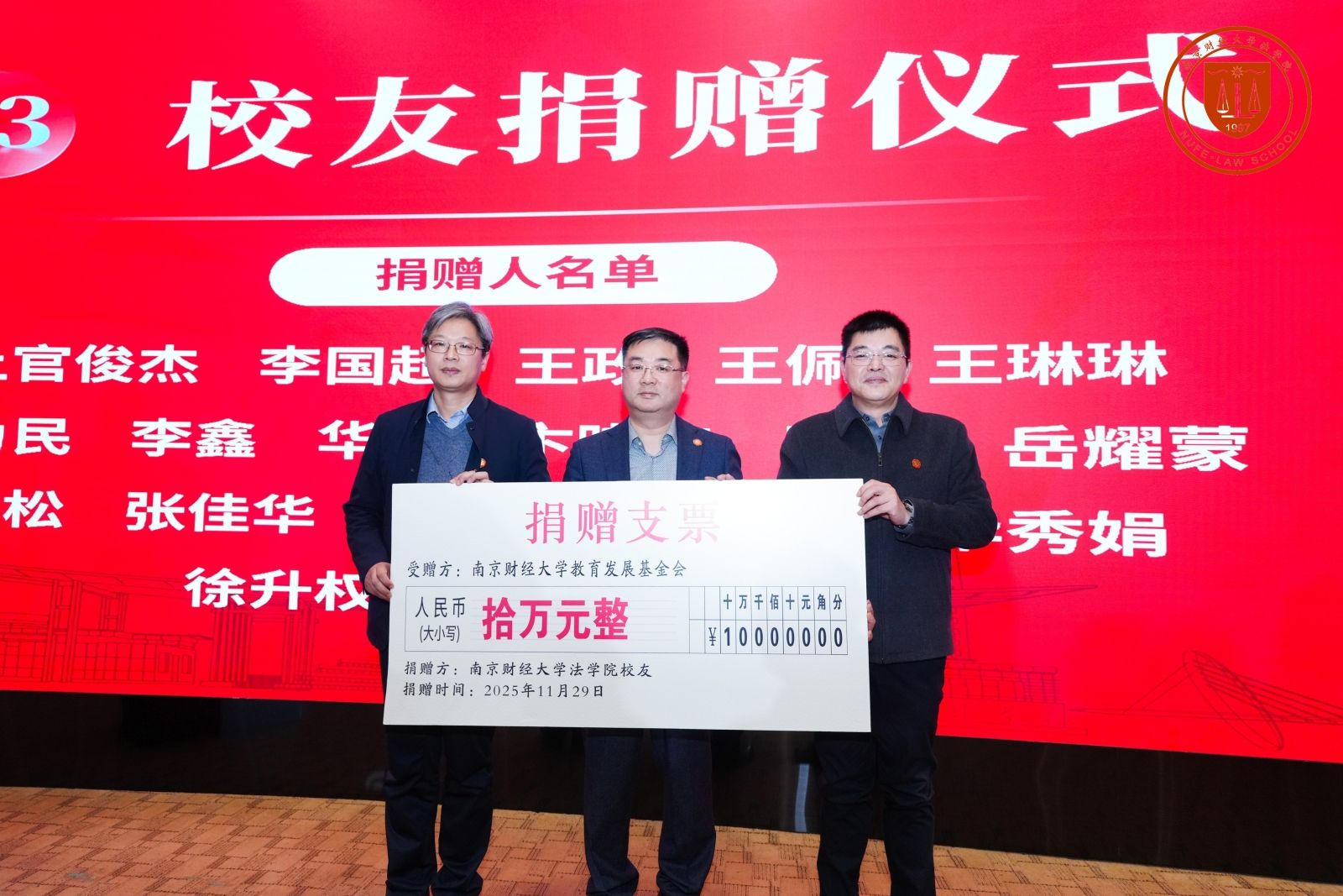 在温馨感人的“致敬恩师”环节,校友代表为法学院老教师代表献上鲜花,表达对恩师的崇高敬意与深深感激。随后,大会举行了“创新创业导师”聘任仪式和“法学院教育发展基金”启动仪式暨校友捐赠仪式,展现了校友们支持学院发展、助力学子成长的深切情怀与实际行动。