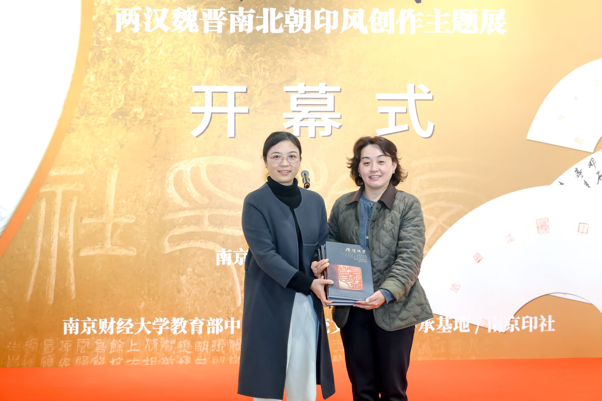 12月2日下午,“西泠印社藏历代印章原拓题跋扇面展”暨“斩截之迹——两汉魏晋南北朝印风创作主题展”在我校美术馆开幕。全国政协常委、校长程永波,中国文联副主席、西泠印社副社长兼秘书长陈振濂,党委常委、副校长叶林祥,西泠印社党委委员、社委会副主任王丽艳,校党政办,党委宣传部,科研院,艺术教育中心等部门负责人,以及我校本次江苏艺术基金篆刻人才培训班全体学员、篆刻传承基地师生和书法篆刻专业研究生代表共同参会。开幕式上,程永波校长与陈振濂副主席共同为“南京财经大学印章艺术与数字人文融创研究所”揭牌。校科学研究院副院长肖玉杰主持本次活动。