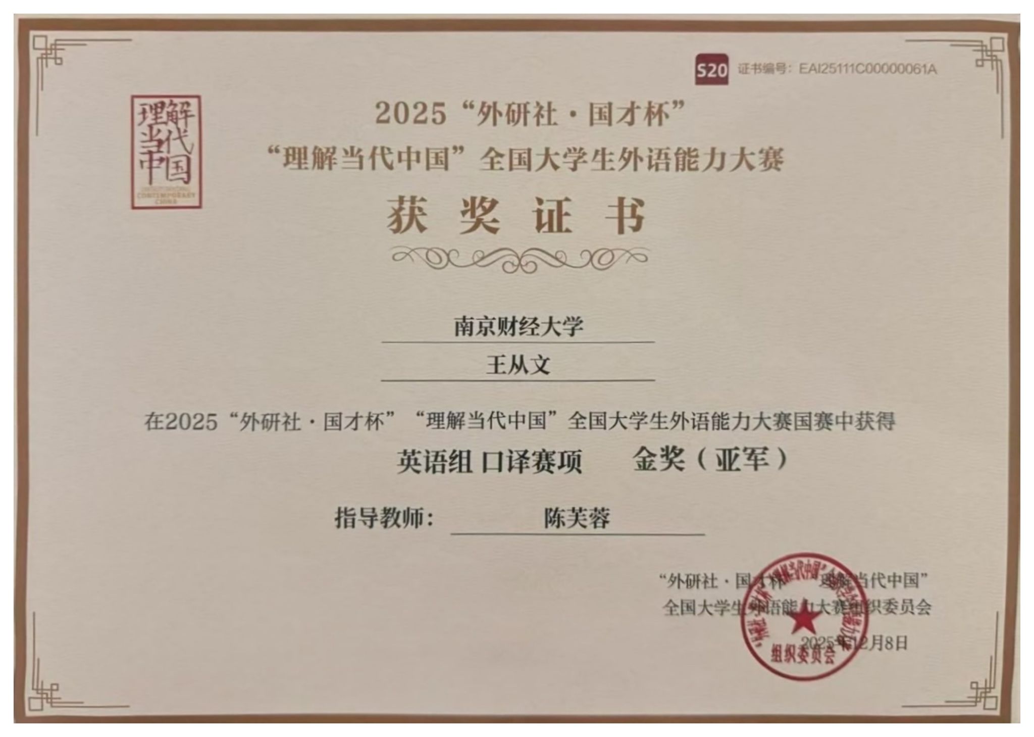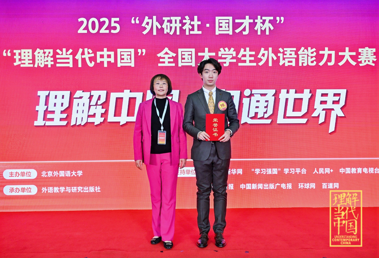 12月6日,2025“外研社·国才杯”“理解当代中国”全国大学生外语能力大赛英语组口译赛项全国总决赛在北京举行。我校国际经贸学院国贸(实验班)2401班王从文同学(指导老师:外国语学院副教授陈芙蓉),凭借过硬的专业实力与出色的临场发挥,从全国众多优秀学子中脱颖而出,勇夺全国总决赛金奖(亚军),总排名位列全国第二,创造了我校在该项赛事中的历史最好成绩。