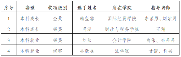 国际经贸学院本科三年级赖玺睿同学以“供应链设计”为职业目标,聚焦“一带一路”专项供应链设计领域,获本科组成长赛道金奖;财政与税务学院本科三年级冯涵同学以“ESG税务咨询师”为职业目标,致力于ESG涉税合规管理,获本科组成长赛道银奖;会计学院本科四年级刘歆同学以“IT审计师”为职业目标,致力于成为数字时代“系统监察官”与“数据质检员”,确保财务数据的有效性、安全性和可靠性,获本科就业赛道银奖;法学院本科四年级吴欣昱同学以“社区工作者”为职业目标,获得本科组就业赛道铜奖。
