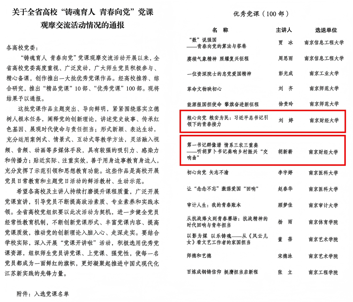 近日,江苏省委组织部、省委教育工委联合印发《关于全省高校“铸魂育人青春向党”党课观摩交流活动情况的通报》(苏组通〔2026〕7号),我校推荐的两部作品《粮心向党 粮安为民:习近平总书记引领下的青春接力》《第一书记群像谱,情系三农三重奏——听胡萝卜书记奏响乡村振兴“交响曲”》成功入选。这是我校首次在省级党课评选活动中斩获佳绩,标志着学校党员教育工作和党课创作质量实现了新突破。
