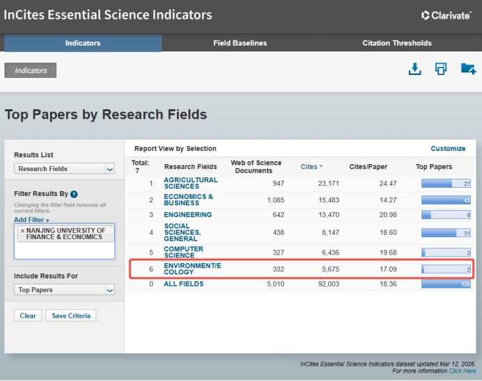 根据最新ESI统计,十年来(2016年1月1日至2026年3月12日),我校“环境/生态学”共发表Web of Science论文332篇,被引次数5675次,篇均被引17.09次,高被引论文2篇,位列全球第2143位(共2169所机构入选)。经济学院、国际经贸学院、公共管理学院、粮食和物资学院、金融学院等学院对“环境/生态学”进入ESI学科排名全球前1%作出较大贡献。