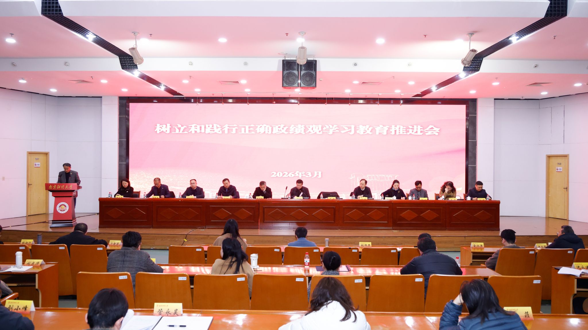 3月20日下午,我校在仙林校区图书馆一楼报告厅召开树立和践行正确政绩观学习教育推进会,对学校学习教育工作进行部署推进。全体校领导,全体党委委员、纪委委员,全体中层正职干部(含主持工作的副职),资产经营有限公司主要负责人参加会议。会议由校党委书记张利民主持。