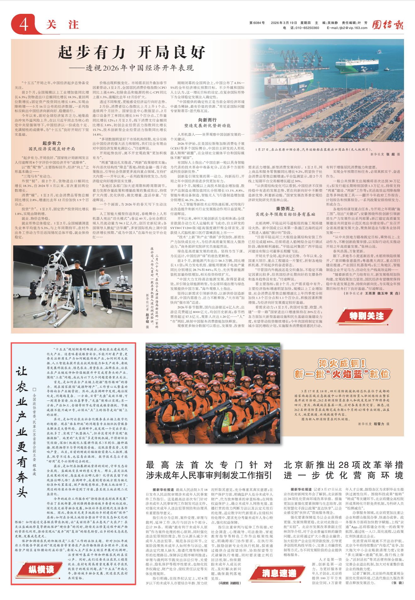 今年的政府工作报告对“持续推进农村改革发展”作出了系统部署,特别强调要推动城乡要素双向流动,深化农文旅等融合发展,加快补齐农村现代生活条件短板。因此,要把目光更多地投向乡村建设的“软件”层面:如何在全域土地综合整治中守住生态和文化的根脉?如何通过完善联农带农机制,让“美丽经济”真正惠及广大农户?在关注盐碱地修复等耕地保护“硬任务”的同时,持续关注修复过程中副产物的资源化利用,推动实现从“废弃”到“复活”的绿色转型,让乡村的生态底色更靓、发展成色更足。