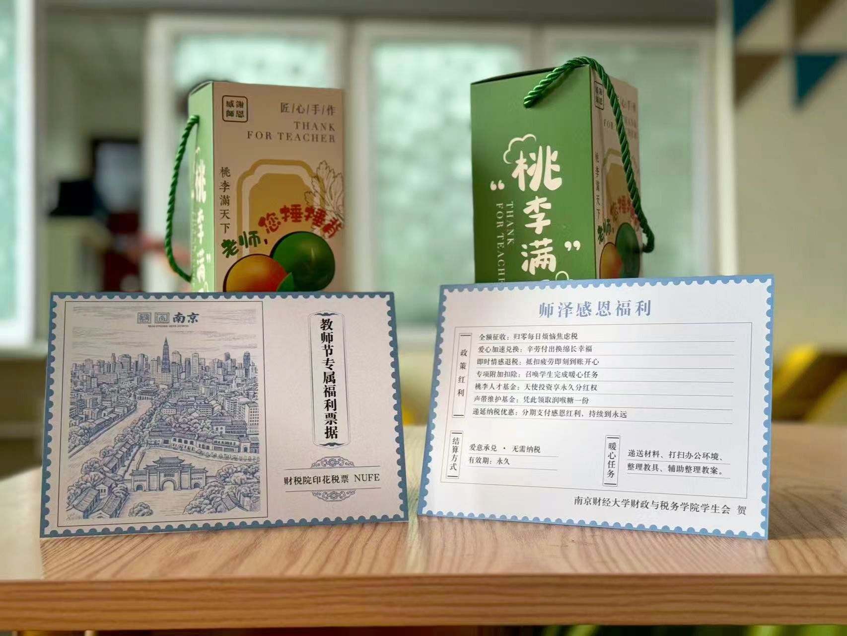 “全额征收:归零每日烦恼焦虑税;爱心加速兑换:辛劳付出换绵长幸福;即时情感退税:抵扣疲劳即刻到账开心……”南财财政与税务学院学子,结合专业特色,为老师们送上了别出心裁的“专属福利票据”。