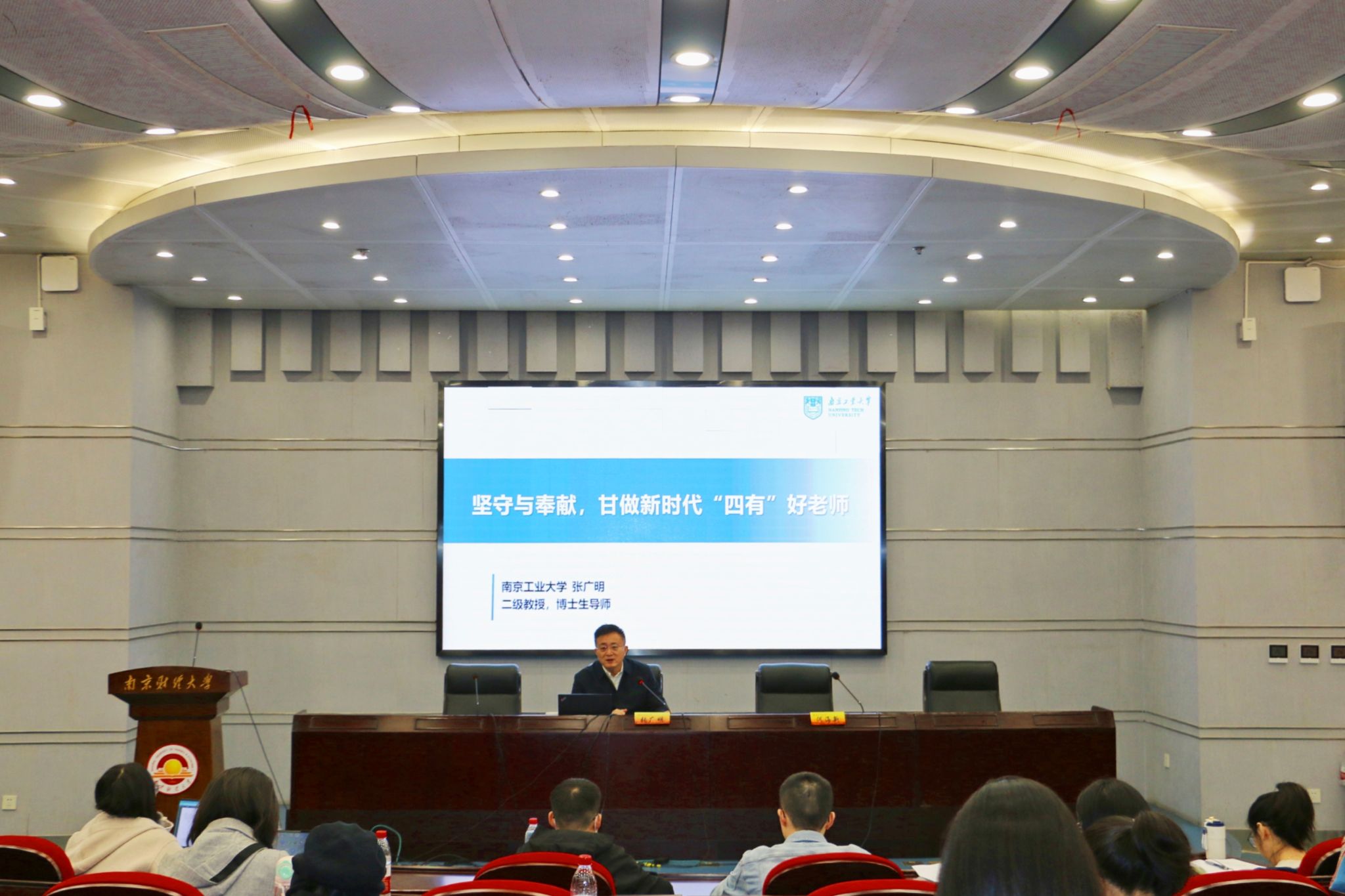 国家级教学名师、南京工业大学张广明教授作了题为“坚守与奉献,甘做新时代‘四有’好老师”的报告。张广明教授以“新时代教师的使命”为开场,系统阐述了教育的本质和属性、新时代对高校教师的新要求,以及高等教育面临的机遇与挑战;以“新时代‘四有’好老师”为主线,指出教师要坚守初心和使命,争做讲政治、理想信念坚定的好老师,懂教育、道德情操高尚的好老师,有大爱、仁爱之心深厚的好老师,会研究、专业学识扎实的好老师,肯实践、知行合一笃行的好老师。最后,张广明教授以“坚守与奉献”作总结,指出教师要以教育家精神为引领,做学生为学、为事、为人示范的大先生。