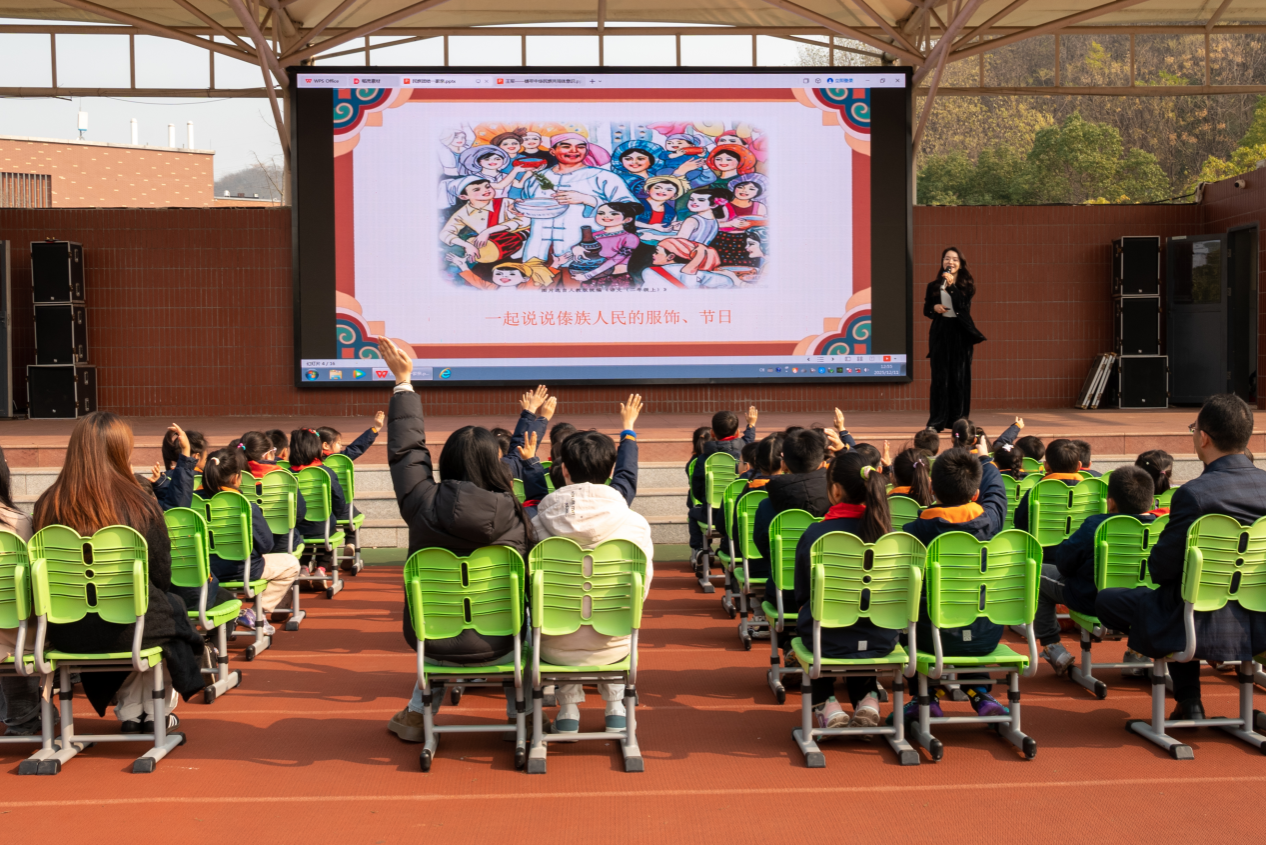 师生们共同观看了一系列展现我国各民族风貌的视频与图文介绍。随后的互动问答环节,大家踊跃发言,在轻松愉悦的交流中进一步理解了“中华民族一家亲”的深刻意义。书画实践环节,随着《中华民族一家亲》音乐声响起,操场中央一幅洁白的长卷徐徐铺开。小学生们用充满想象的笔触,勾勒出鲜艳的民族服饰、欢快的舞蹈人物;大学生们则以“民族团结一家亲”为主题进行书画创作,共绘中华民族共同体意识的时代画卷。