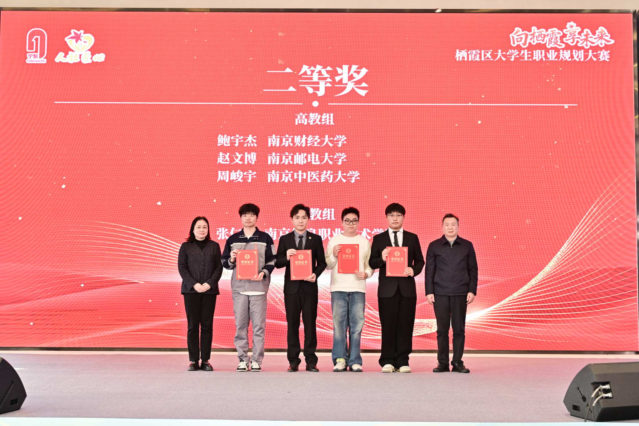为落实高校毕业生就业创业工作部署,践行新时代人才强国战略,助力大学生留宁留栖发展,12月16日,由南京市栖霞区人社局主办的“向栖霞·享未来”栖霞大学生职业规划大赛高教组评选圆满结束。我校金融学院金融2304班鲍宇杰同学获二等奖第一名、营销与物流管理学院广告2201班刘姝均同学获优胜奖第一名。鲍宇杰同学在颁奖典礼上进行风采展示,并获得驻区企业发放的实习offer。