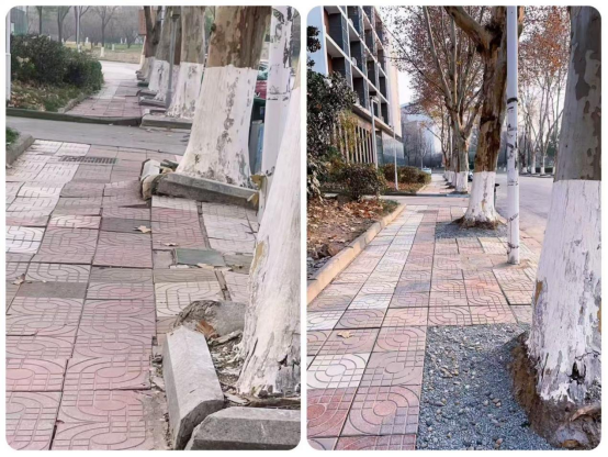 针对上述问题,后勤基建处坚持“标本兼治、系统治理”的工作思路,在前期多次现场勘察与技术论证后,经综合研判,组织实施了法桐大道专项修剪与树池改造相结合的提升工程。在树木修剪方面,招聘专业团队开展冬季集中作业,根据树木生长特性,科学修剪过密枝、病虫枝等,在改善树形、提升树木抗逆性的同时,有效减少倒伏风险,消除安全隐患。在树池改造方面,采取“一树一策”方式,组织工程技术人员与绿化养护专业技术人员按照“拆除—评估—处理—铺设”的标准化流程协同作业。绿化养护专业技术人员负责评估树木根系,对影响路面平整的根系进行科学修剪与清理;工程技术人员负责系统拆除原有树围条石及周边人行道板砖,并在根系处理完成后重新铺设人行道板砖,构建由鹅卵石、碎石等材料组成的新树池。改造后的树池既保障了路面平整与通行安全,也增强了透水透气功能,实现了实用性与美观性的有机结合。