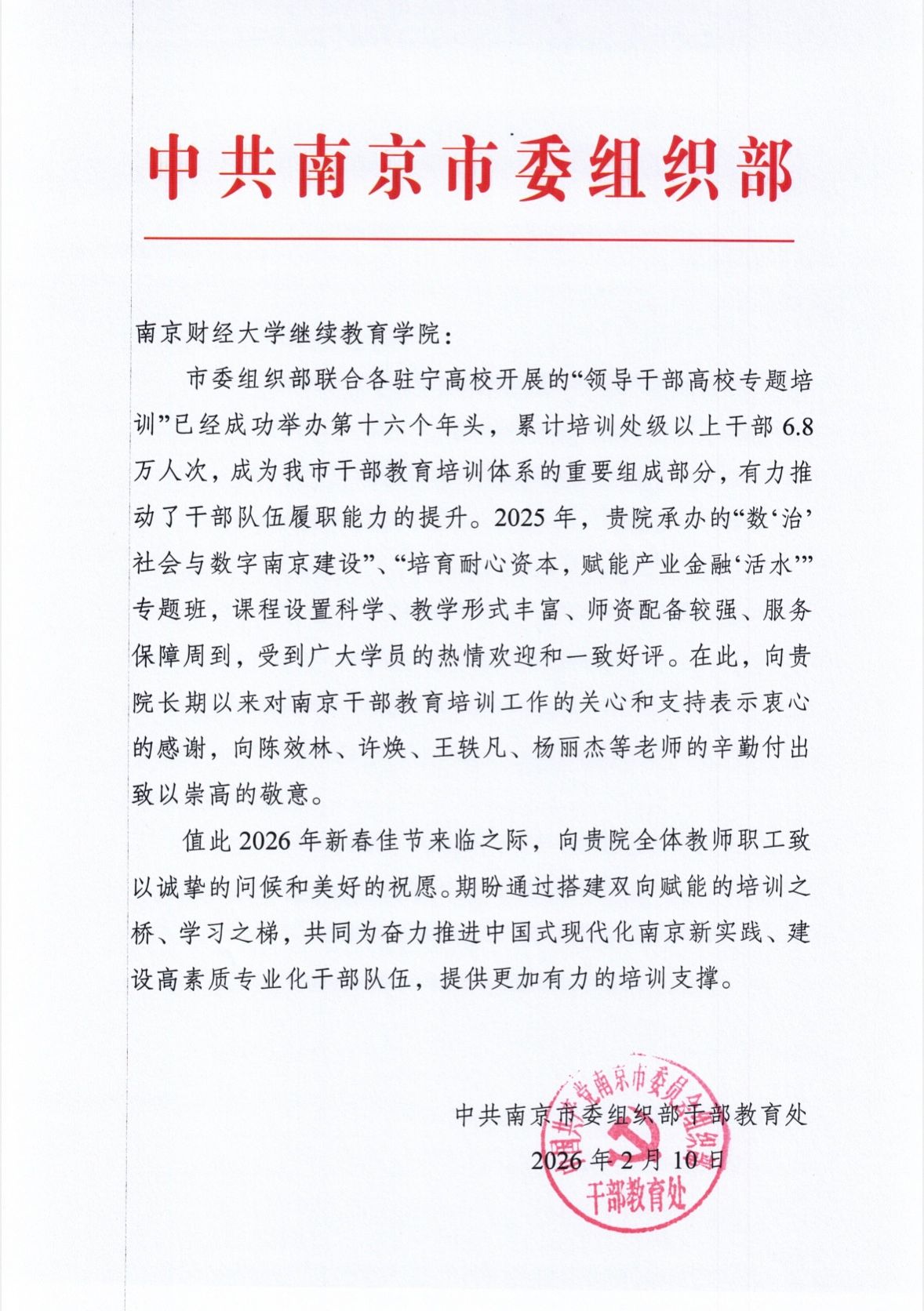 近日,中共南京市委组织部干部教育处向我校继续教育学院发来感谢信,对我校长期以来关心支持南京市干部教育培训工作表示感谢。