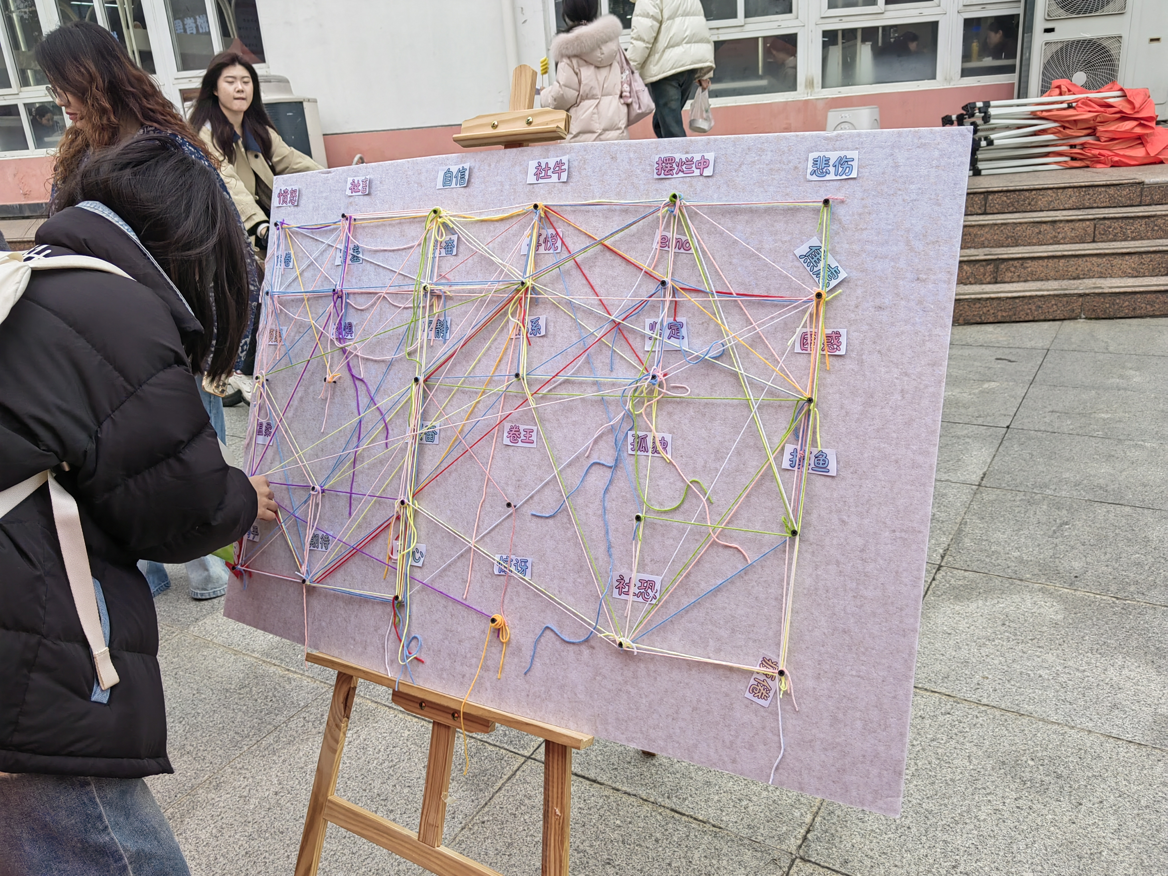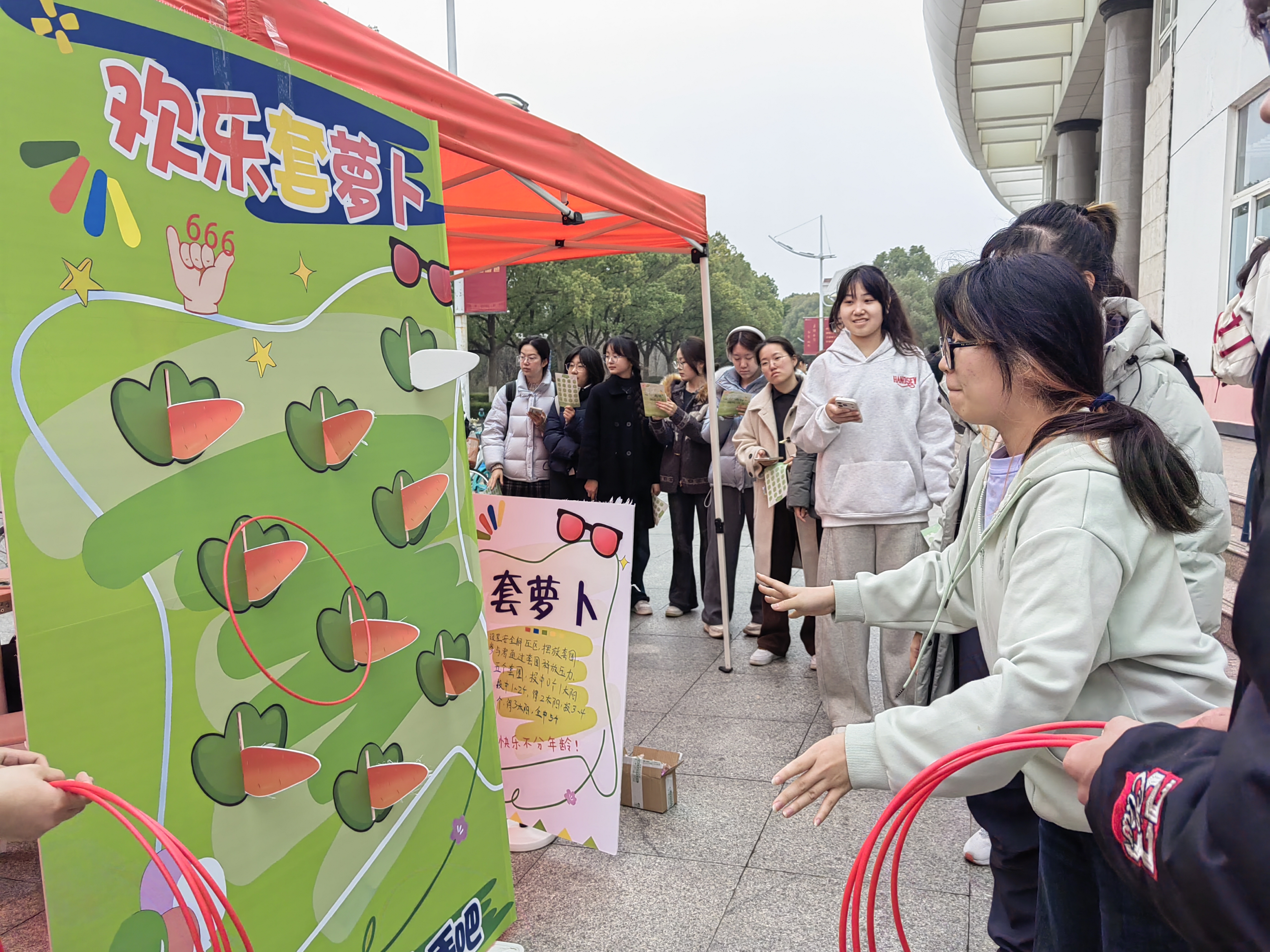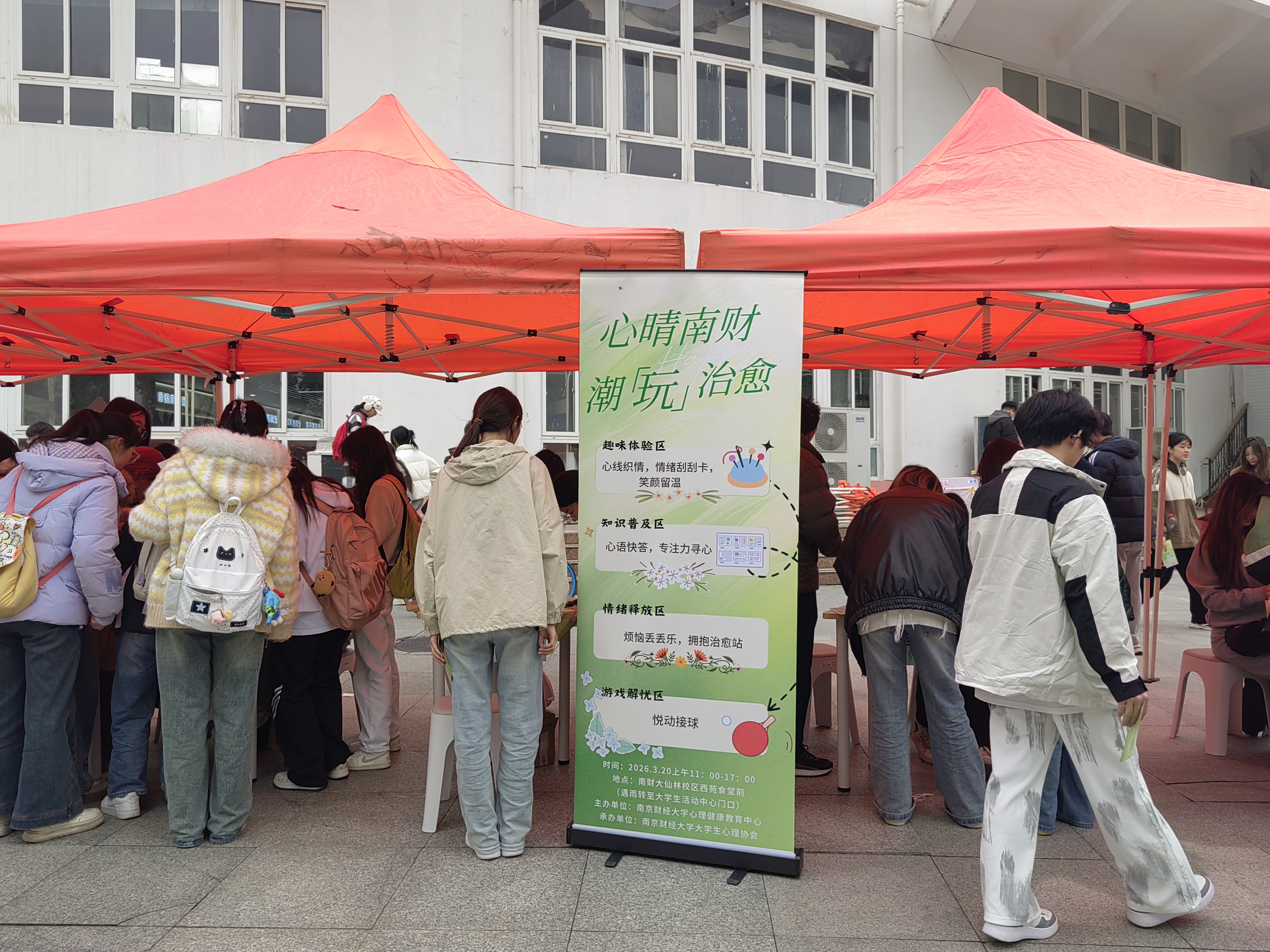 由我校心理健康教育中心主办、大学生心理协会承办的“心晴南财,潮玩治愈”活动在仙林校区西苑食堂广场举办,吸引了全校600余名同学参与。本次活动将食堂广场打造为开放式心理健康教育场域,通过丰富的互动形式,让心理健康教育更贴近学生日常生活。活动共设置趣味体验区、知识普及区、情绪释放区、游戏解忧区四大功能板块,推出“心线织情”“情绪刮刮卡”“欢乐套萝卜”等特色项目,现场欢声笑语不断,同学们在玩中解压、在乐中成长。在趣味体验区,“心线织情——情绪毛线”项目吸引了众多同学驻足,大家选择代表当下情绪的彩色毛线,缠绕在描述近期感受的词语上,在缠绕过程中觉察自我情绪、梳理内心感受;“情绪刮刮卡”让同学们一笔刮去烦恼与焦虑,压抑情绪随涂层消散,收获轻松与治愈。在知识普及区,“心语快答”以抢答形式普及心理健康知识,同学们在趣味问答中学习情绪管理技巧、了解心理求助渠道。在情绪释放区,“欢乐套萝卜”设置安全解压区,同学们通过敲击解压球、趣味套圈等方式释放压力,在欢声笑语中卸下疲惫。在游戏解忧区,“悦动接球”以双人组队形式开展,同学们配合抛接乒乓球,在协作与奔跑中培养团队默契,在游戏中感受人际联结,在交流中获得愉悦。