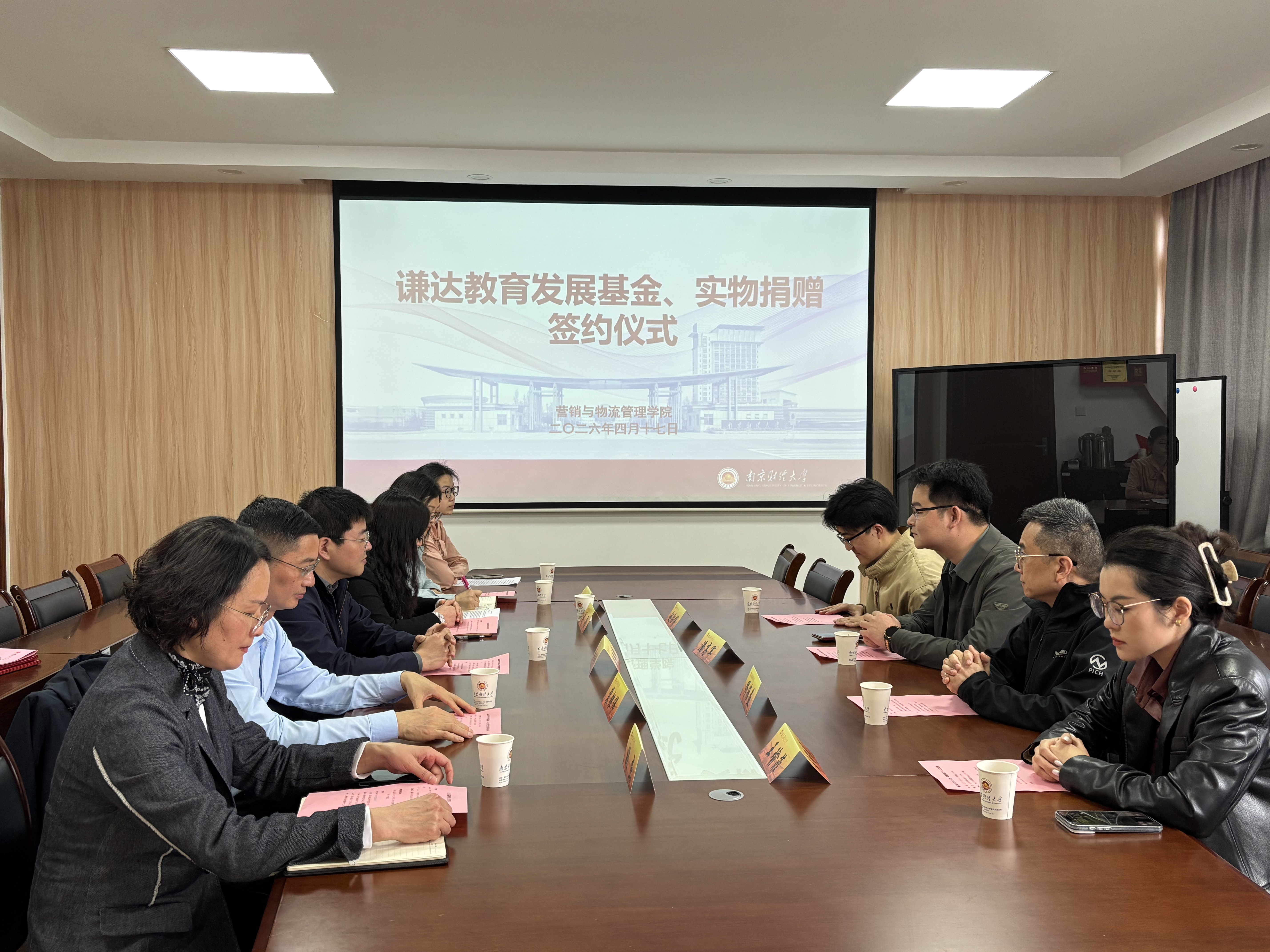 4月17日上午,营销与物流管理学院与南京谦达教育科技有限公司捐赠签约仪式在仙林校区德业楼535会议室举行。谦达教育合伙人、市场营销2016级校友潘高军,谦达教育仙林分校校长、市场营销2016级校友赵钰博,谦达教育就业办负责人、市场营销2018级校友王瑜菲,学院校友会执行会长、广告学1995级校友缪维益,我校对外联络处处长陆明峰、副处长裴银伟,学院党政领导、师生代表参加仪式。仪式由学院党委书记刘颖主持。