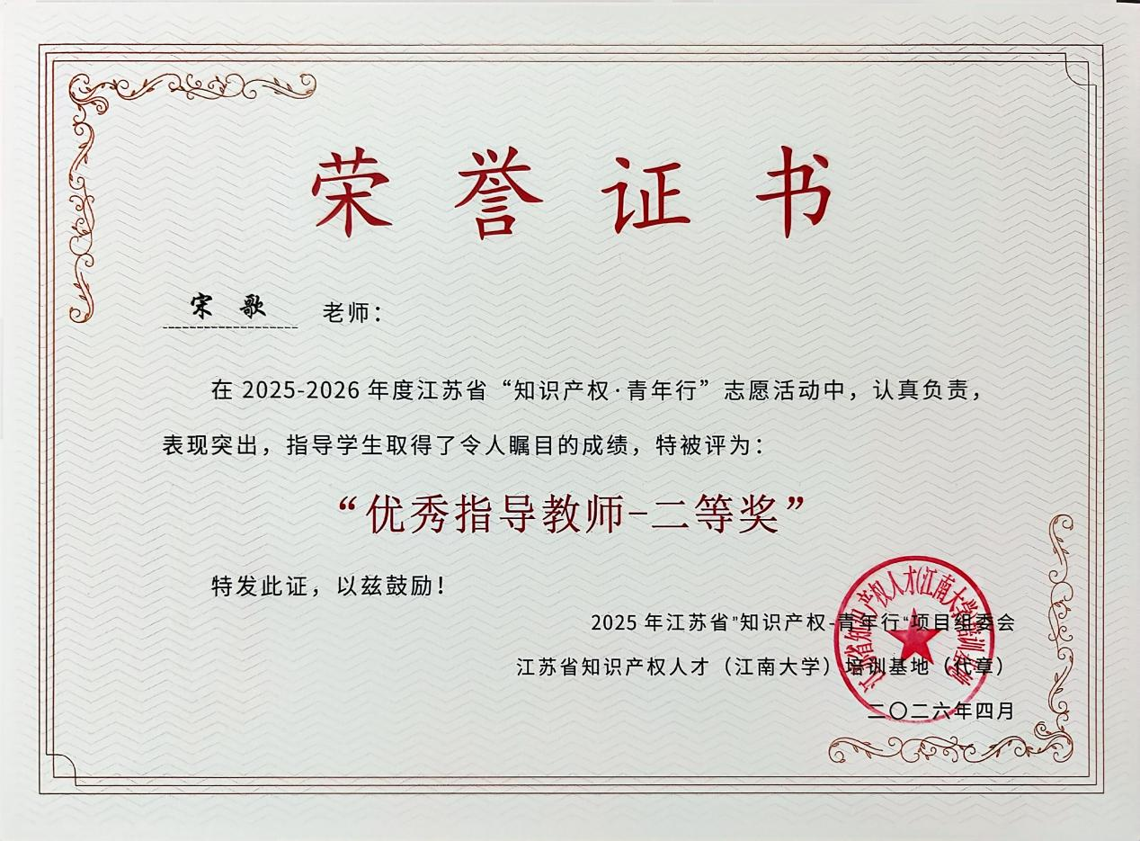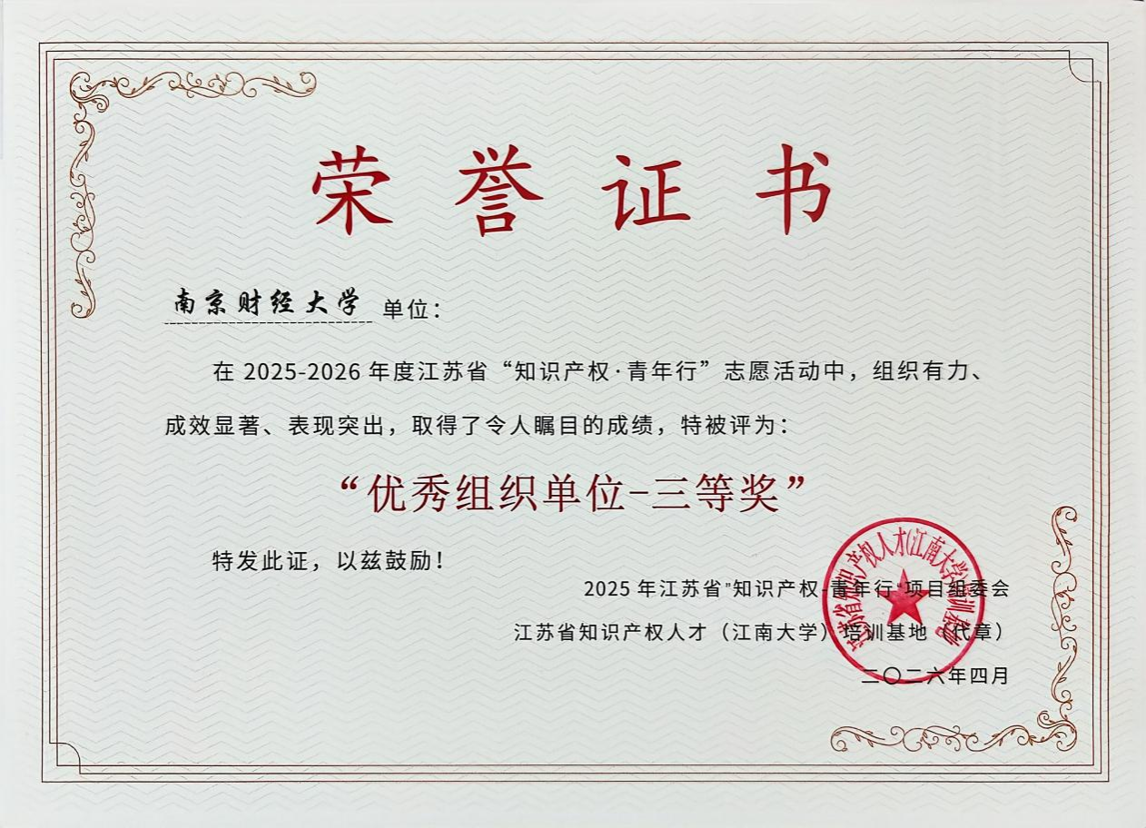 近日,2025-2026年度江苏省“知识产权·青年行”志愿活动评选结果公布,法学院师生凭借扎实的专业能力与突出的实践表现斩获多项荣誉。由李阳、张华宇、陈婕、刘冰玉洋等同学组成的参赛团队表现优异,我校荣获“优秀组织单位三等奖”,法学院宋歌老师获“优秀指导教师二等奖”。