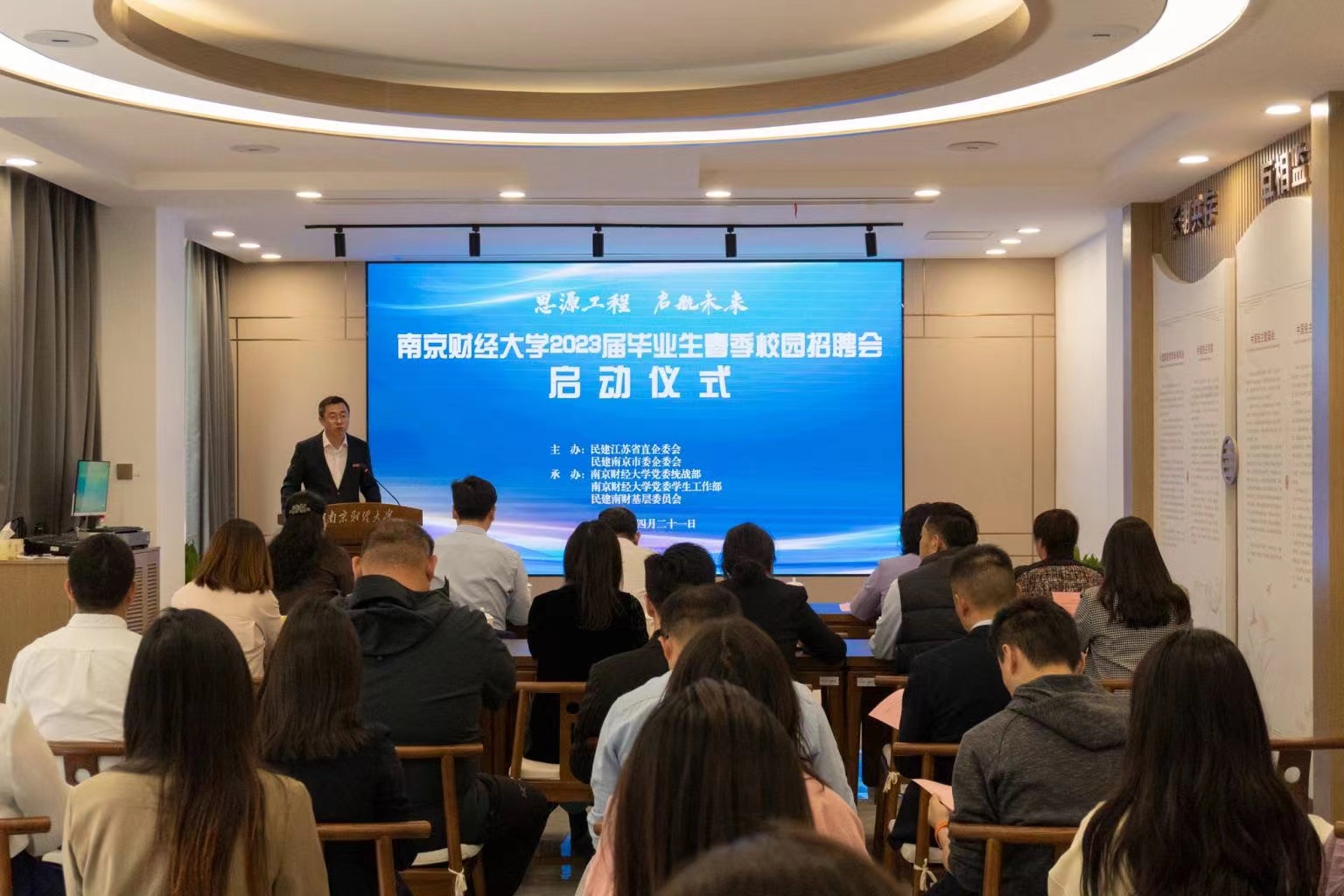 4月21日下午,“思源工程 启航未来”民建企业家进校园暨2023届毕业生春季校园招聘会在仙林校区举行。江苏省政协副秘书长、民建江苏省委专职副主委常本春,党委常委、副校长赵国栋,南京市政协副秘书长、民建南京市委专职副主委杨卫青出席招聘会启动仪式。民建江苏省直、民建南京市委相关领导和企业家代表,我校党委统战部、学生工作部相关领导,校民建委员会部分会员及毕业生代表参加启动仪式。启动仪式由党委常委、统战部部长吕戎主持。