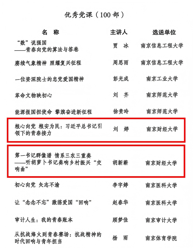 近日,江苏省委组织部、省委教育工委联合印发《关于全省高校“铸魂育人青春向党”党课观摩交流活动情况的通报》(苏组通〔2026〕7号),我校推荐的两部作品《粮心向党 粮安为民:习近平总书记引领下的青春接力》《第一书记群像谱,情系三农三重奏——听胡萝卜书记奏响乡村振兴“交响曲”》成功入选。这是我校首次在省级党课评选活动中斩获佳绩,标志着学校党员教育工作和党课创作质量实现了新突破。