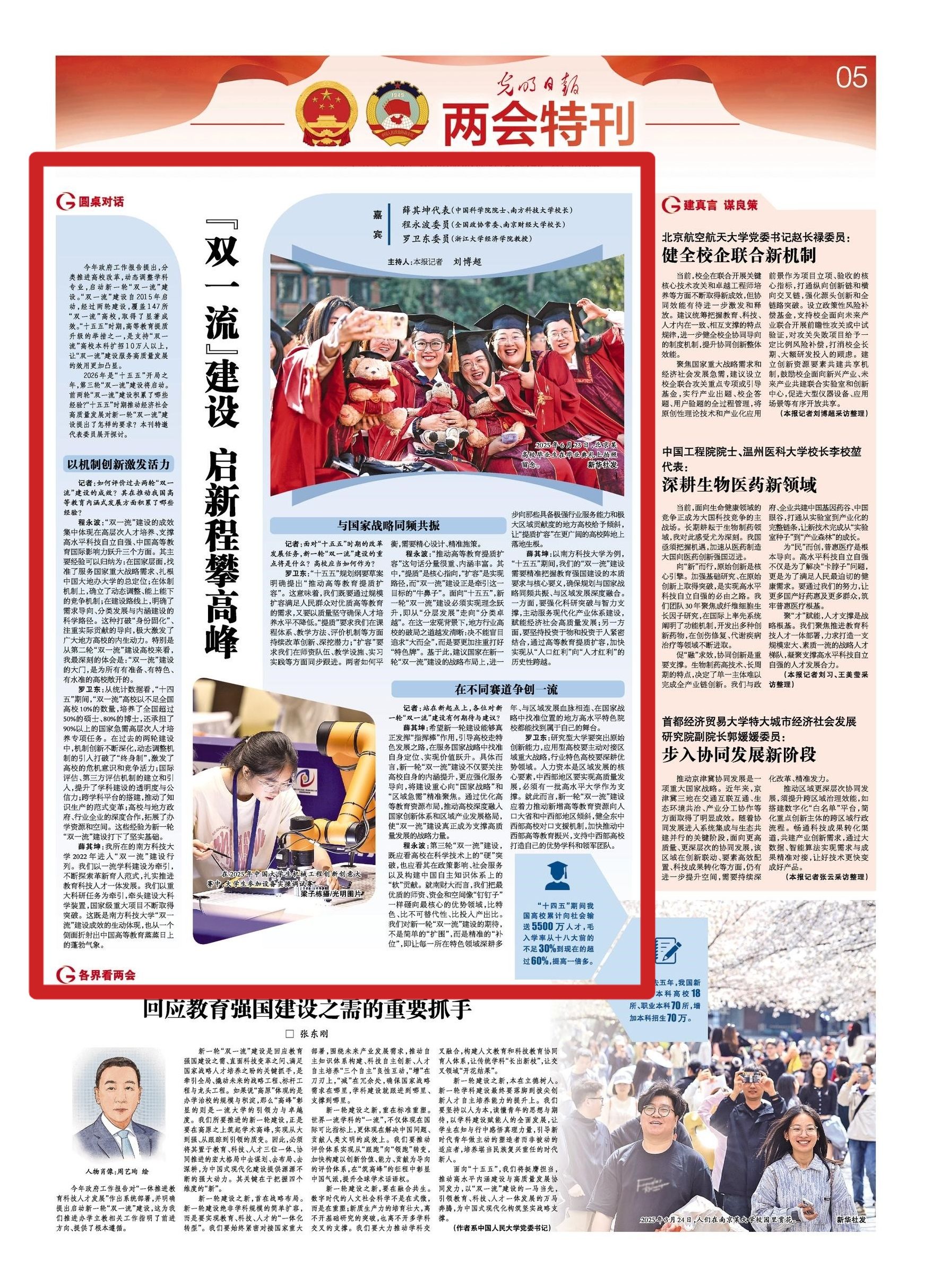 2026年是“十五五”开局之年,第三轮“双一流”建设将启动。前两轮“双一流”建设积累了哪些经验?“十五五”时期推动经济社会高质量发展对新一轮“双一流”建设提出了怎样的要求?本刊特邀代表委员展开探讨。