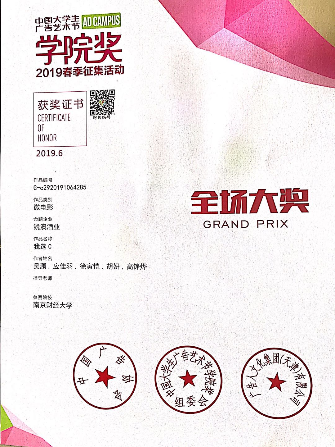 6月26日晚,中国大学生广告艺术节学院奖2019春季赛颁奖盛典在北京落下帷幕。我校推荐的作品《微醺,是我与世界的和解》(参赛成员:吴澜、胡妍、应佳羽、高铮烨<新闻学院>,徐寅恺<艺术设计学院>)获得了锐澳酒业命题微电影类金奖,并与其他5组金奖比拼后最终脱颖而出,赢得了唯一的全场大奖,也是此项赛事的最高殊荣,并获得5万元奖励。