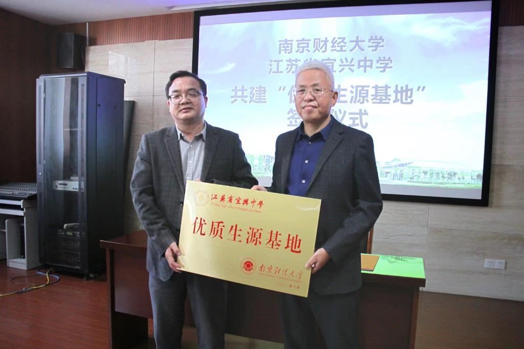 随后,刘浩书记与姚伟荣校长共同签署《南京财经大学与江苏省宜兴中学优质生源基地建设协议书》,刘浩书记向姚伟荣校长授予省宜兴中学“南京财经大学优质生源基地”铜牌。