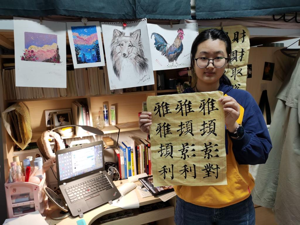 “在宿舍练习书法能平心静气、培养良好心态,封闭管理的这段特殊时期,给了我更多沉淀思考的时间,也让我对书法的热爱得到彻底‘释放’。”外国语学院张耀月同学每周参加校内、校外的线上书法交流会,在线上观摩学习专业老师的运笔、字形结构,遇到不懂的,就请教老师,在宿舍里再琢磨、练习,这段时间书法进步得很快。她说,“阻挡我们青春的不是疫情,而是我们自己本身。只要我们自己不对生活失去希望,坚决拒绝‘躺平’,保持积极向上的心态,努力去搜寻生活中的美好与那些不经意的温暖,就一定能绽放青春风采,展现青春力量!”