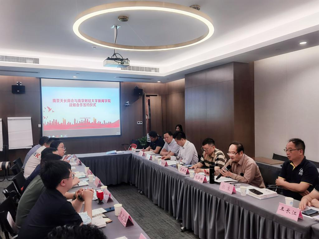 5月24日下午,新闻学院党总支书记高晓东、党总支副书记李博伟、学生处副处长李娜一行赴南京天合广场走访南京天长商会,就开展校企共建、就业实习等进行座谈交流。南京天长商会会长夏明龙、商会党支部书记闵济林、秘书长孙连斌、常务副会长华起,南京大学历史学院院长张生、商学院教授王长江,天长市电视台台长刘兴民等参加座谈。夏明龙会长对高晓东书记一行的到访表示热烈欢迎,介绍了南京天长商会的发展情况,他表示,天长商会是南京天长籍企业家交流合作平台,会员企业涉及行业广泛,近年来随着企业高质量发展的需要,对高水平人才的需求更为迫切。希望借此机会,搭建校企合作平台,为更多会员企业吸纳优秀人才创造条件。闵济林书记介绍了南京天长商会党支部的基本概况和党建活动开展情况。高晓东书记介绍了新闻学院发展情况以及学院党建工作特色。李娜副处长介绍了学校人才培养和近期访企拓岗专项行动的相关情况,希望能以此次交流为契机,进一步加强学校与商会企业的交流合作,更好地为企业提供优秀人才,实现高质量就业,实现共同发展。交流结束后,高晓东书记代表新闻学院与南京天长商会签订了战略合作协议和党建共建协议。李博伟副书记代表新闻学院与商会会员——江苏省计算机技术服务有限公司、南京艾兰斯贸易有限公司等八家企业签订了就业实习基地协议。